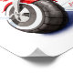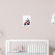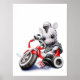 Este único impressão de berçário apresenta uma zebra bebê vestindo botas e jaquetas de motoqueiros enquanto cavalga um triciclo vermelho.