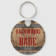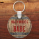 Legal chaveiro para aqueles que vivem no campo a vida mostra "Backwoods Babe" o texto vermelho escuro angustiado com rico florescendo sobre um fundo de whiskey keg.