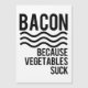 O bacon engraçado cita cartão de metal em negrito: Bacon Porque Vegetais Chupam! Bacon é popular, muito popular. Todo mundo adora bacon. Coma tiras de bacon e fitas de bacon e mais tiras de bacon. Todos os seus problemas desaparecerão para sempre quando você ama bacon e ignora vegetais.