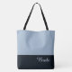 Esta bela bolsa de tote de moda à frente mostra a palavra "noiva" em cor de texto branco sobre o azul escuro mais profundo da meia-noite com a bolsa de tote superior em azul antigo personalizado com texto azul Rainy Day azul. Tem bastante espaço para texto personalizado. Os gráficos e o texto estão em ambos os lados desta bolsa de tote. Alça preta. Personalize mais ou mais comprares, conforme mostrado.