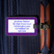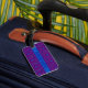 Uma bonito etiqueta de bagagem de lado duplo, acrílica, com um padrão de formas tradicionais de ogee em tons de roxo e azul. A correia está em couro.