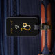 Etiqueta de bagagem elegante com letreiro de ouro sobre fundo preto.