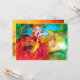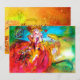 Personagem colorida, caprichosa e vibrante de máscara veneziana. Linda mulher loira sofisticada sentada com uma rosa vermelha e uma máscara de penas na mão com tecidos dourados cintilantes de fúcsia de um traje de baile de máscaras barroco com penas e um cachorro. Pintura em aquarela com cores brilhantes em azul, amarelo, rosa, verde, brilho dourado e folha de prata, inspirada em personagens da Comédia da Arte (Commedia dell'Arte), Carnaval de Veneza e máscaras de penas venezianas. Este design legal e artístico é perfeito para casamentos, cerimônias nupciais, chás de noiva, festas de 16 anos, festas de Quinceañera, festas de Halloween, bailes de máscaras, bailes dançantes, propostas de casamento românticas, anúncios de "salve a