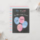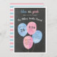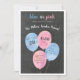 Sexo festivo revela convites de festas que apresentam fundo preto no quadro, com balões cor-de-água cor rosa e azul, com seu gênero, revelam detalhes da festa. "Azul ou rosa, o que você acha?" aparece no topo junto com seu nome de família.