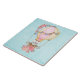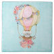 Azulejo cerâmico com um adorável design com ilustração de aquarela. Um balão de ar quente decorado com flores bonito, vermelhas e rosa. Um pequeno ursinho branco giro sentado na cesta. Fundo azul claro.