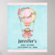 Um poster chá de fraldas com um adorável design com uma ilustração de aquarela. Um balão de ar quente decorado com flores bonito, vermelhas e rosa. Um pequeno ursinho branco giro sentado na cesta.