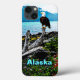 Uma pintura digital de uma águia careca empoleirada em uma torre de madeira derivada lavada na costa rochosa do Alasca; montanhas ficam à distância. A leitura de texto "Alaska" também é exibida.