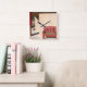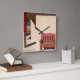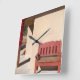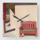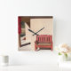 Um banco vermelho primitivo contra uma parede de stucco no sol. Uma corda de pimenta-do-pimento, chamada de ristra, também está na foto deste relógio.