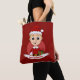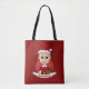 Saco com uma ilustração de um sorridente e feliz rapaz loiro, ele está vestindo uma fantasia vermelha e branca do Papai Noel e segurando um presente; com um modelo de texto editável para seu nome ou mensagem, design de Natal com fundo vermelho