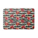 Este belo tapete de banho listrado preto e branco tem grandes flores vermelhas de poinsettia com folhas verdes, cones de pínus castanhos e bagas vermelhas.