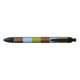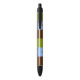 Caneta com bandeira de Fresno, Califórnia; bandeira com três bandas verticais de castanho, azul e verde, com ilustrações estilizadas de berço, planta e sol