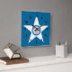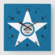 Relógio com bandeira de Houston, Texas; bandeira azul com selo de Houston numa estrela branca, com ilustração de um comboio