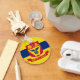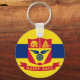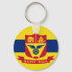 Chaveiro de botão com bandeira da cidade de Rua Paul, Minnesota; bandeira com três faixas horizontais de azul e amarelo com emblema vermelho no centro