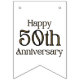 Esta bandeira apresenta as palavras "Aniversário de 50 anos Feliz" em uma fonte de impressão única com letras douradas e contorno preto. Todas as bandeiras têm impressão de um lado, são seguras para uso ao ar livre, feitas de plástico poliestireno resistente e corda de plástico grossa, tem (16) bandeirolas de cauda de andorinha de 5,5" x 8" em uma corda de 6 pés de comprimento.