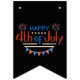 Esta bandeira de bunting apresenta as palavras "Feliz 4 de Julho" mais cinco estrelas com ícone de fogos de artifício em cada lado e uma faixa abaixo exibindo um estilo tipográfico vermelho, branco e azul neste tema do Dia da Independência de 4 de Julho. Todas as bandeiras têm impressão unilateral segura para uso ao ar livre e são feitas com corda de plástico grossa e têm (16) bandeirolas de cauda de andorinha de 5,5" x 8" em uma corda de 6 pés de comprimento.