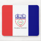 Mousepad com pavilhão da cidade de Cleveland, Ohio; pavilhão com três bandas verticais de vermelho, branco e azul com selo da cidade no centro