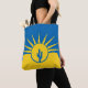 Saco com bandeira da cidade de Mesa, Arizona; bandeira amarela e azul com ilustrações estilizadas de deserto, cacto e sol ascensão