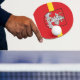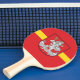 Pá de pingue-pongue com design com pavilhão de Vilnius, capital da Lituânia; bandeira vermelha com faixa amarela e casacos de armas com dois leões ouro segurando um escudo no centro
