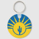 Chaveiro de botões com bandeira da cidade de Mesa, Arizona; bandeira amarela e azul com ilustrações estilizadas de deserto, cacto e sol ascensão