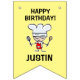 O tema de panificação das bandeiras de Festa de aniversário. Design divertida para a celebração infantil perto da cozinha. Adicione as suas próprias cores de texto e fundo personalizadas. Um desenho animado feito de pastelaria engraçado com avental vermelho segurando um uísque e colher de madeira. Fornecimentos de partidos personalizados para crianças.