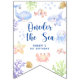 SOB O MAR. Oneder The Sea - Um belo animal submarino temido pelo primeiro aniversario convite com animais da cor da água - baleia, águas-vivas, marisco, peixe-palha, caranguejo, tubarão e corais. Bolhas de água e conchas.