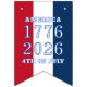 A red white and blue stripes bunting banner with editable text: AMERICA 1776 2026 4TH OF JULY, for celebration parties and events.