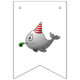 Bandeiras com uma bela ilustração de uma baleia. A baleia está vestindo um chapéu de festa listrado vermelho e branco e começou a festa de aniversário.
