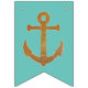 Bonito banner náutico de beliche de casamento com tema aquático, com faixas de tom de ouro e bolinhas nas bandeiras. Gráficos de uma âncora com aspecto brilhante de ouro decoram quatro das bandeiras. O Sr. & Sra. decora as bandeiras do aqua de cor sólida no meio. Excelente para a sua recepção de casamento.