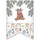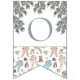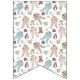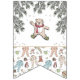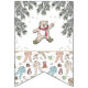 Estas bandeiras de bundas "Welcome Baby", neutras em termos de gênero, apresentam ilustrações bonitinhas desenhadas à mão de fatos para bebês de Natal, animais peludos (Teddy Bear, Reindeer, Penguin), garrafas, bíblias, pacificantes, presentes envoltos e minúsculas estrelas amarelas. Fundo branco.