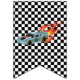 Este legal e moderno bunting de aniversários de criança com tema de carros de corrida apresenta bandeiras de corrida, com um carro azul quente com rodas pretas, e um design de corrida.