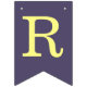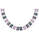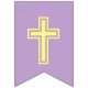 As bandeirinhas têm nuances alternadas de roxo claro, roxo escuro e azul-marinho. As letras são amarelas. Há 2 cruzes amarelas entre as palavras. A mensagem é "Deus Abençoe" seguida de um nome de 6 letras que você deve alterar letra por letra (o padrão é André).