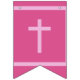 Um ajustado de bandeira de bunting para batismos, primeiros sindicatos ou confirmações religiosas. As bandeiras têm cor alternada: rosa, lilás (roxo claro) para as letras e fúcsia ao redor das palavras. As letras são ouro amarelas. Há 4 cruzes lilás (sobre fundo fuchsia) ao redor das palavras. A mensagem é "Deus abençoe" seguida de um nome de 4 letras que você deve alterar a letra por letra (o padrão é Emma).