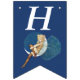 Esta bandeira em forma de "Parabéns Feliz Aniversário" é azul-escuro com letras brancas e uma fada bonito com cabelos loiros e asas azuis claras sentados numa lua crescente vestindo meias de seda. Personalize o ano de aniversário com os modelos.
