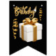 Esta faixa de bunting exibe a palavra "Aniversário" em uma fonte de impressão estilo manuscrito cursivo com letras coloridas douradas com contorno branco, apresentando um chapéu de aniversário, serpentinas e presente neste tema e estilo de aniversário. Todas as faixas têm impressão de um lado, são seguras para uso ao ar livre, feitas com poliestireno plástico resistente e corda de plástico grossa, tem (16) bandeiras em forma de andorinha de 5,5" x 8" em uma corda de 1,8 metros de comprimento.