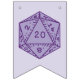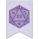 Comemore um aniversário especial com este banner de sinalizador de agrupamento de temas D&D. Tem as palavras "Parabéns" e decorações de dados d20 em um tema roxo.