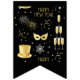 Este banner de bandeirolas exibe as palavras "Feliz Ano Novo" em uma fonte única/de impressão fina com letras douradas e fogos de artifício, confetes, máscara, chapéus e formas e padrões de taças de champanhe neste tema e estilo de Ano Novo. Todos os banners têm impressão unilateral segura para uso ao ar livre feitos com poliestireno plástico resistente e corda de plástico grossa tem (16) bandeirolas de cauda de andorinha de 5,5" x 8" em uma corda de 6 pés de comprimento.
