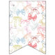 Um revestimento de festa de aniversário pintado com cores aquáticas, com fontes brancas com fitas e arcos em cores lúcidas e lúcidas.