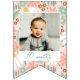 Celebrate your little one’s first year with this beautiful boho daisy wildflower photo banner! Featuring soft watercolor blooms and earthy pink tones, it includes space for 12 monthly photos plus a newborn photo, along with “My First Year” details — height, weight, teeth, favorites, and milestones. A lovely keepsake and perfect 1st birthday decoration for a floral or boho-themed party.