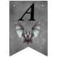 This flag shaped bunting Happy Halloween banner has to black crescent moons and colourfuly flying bats in grey, pink, greenish blue, and orange. Customise the Happy Halloween text with the templates.