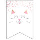 O tema do gatinho divertido, bandeiras de festa de aniversário como decoração de festas. Tem a face de um gato sorridente em ambas as extremidades com brilho rosa e dourado. As palavras dizem "FELIZ ANIVERSÁRIO." Design para a festa de aniversário de sua garota.