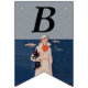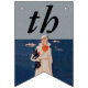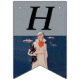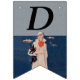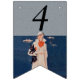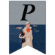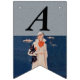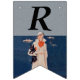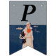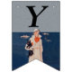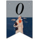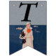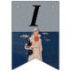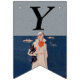 Esta bandeira em forma de bunting banner tem uma senhora em um terno branco parado pelo oceano com barcos no fundo segurando um Terrier Dog preto. Personalize o texto aniversário de 40 anos Feliz com os modelos.