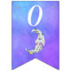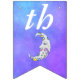 Esta bandeira em forma de bunting Happy Birthday tem uma lua festiva colorida com um rosto bonito, olhos azuis e lábios cor-de-rosa. É decorado com formas de rico amarelas, azuis e roxas sobre um fundo do céu roxo. Personalize o ano de aniversário com os modelos.