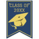 As decorações simples, mas na moda, com bandeiras de caça apresentam uma borda dourada e um texto dourado moderno sobre um fundo azul marinho. Uma elegante procura por um segundo grau ou festa de formatura de formando universitário.
