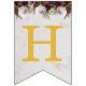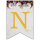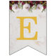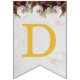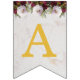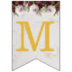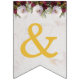 Uma flâmula de bandeirolas floral, um estandarte digno de um casamento, com os nomes personalizáveis da noiva e do noivo, unidos por &. Há 16 bandeirolas, o suficiente para um nome com 7 letras e outro com 8 letras. Os nomes padrão são "Danielle & Michael".