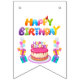 Esta faixa de bunting mostra um design que tem um bolo de aniversário exibindo as palavras "Parabéns" em cima em uma fonte impressão com estilo de bolha com presentes e balões em cada lado. Este design também apresenta um estilo de desenho animado feliz aniversário com chapéu de festa e forma dentro das letras no topo neste tema e estilo de aniversário. Todos os banners têm impressão frente e verso em solteiro, segura, feita com poliestireno plástico resistente e a corda plástica espessa tem (16) bandeiras de 5,5" x 8" em uma corda longa de 6'.