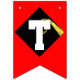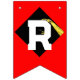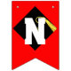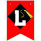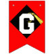 Banner de parabéns pela festa de formatura com boné de formatura preto e ouro sobre fundo vermelho.