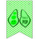 Este belo bunting apresenta uma imagem gráfica de uma vagem verde de Ervilha contendo 3 ervilhas verdes. A maior ervilha tem um rosto bonito com olhos e boca. Do outro lado da ervilha, em texto verde mais escuro, diz "Pronto para Pop". A design é ideal para um anúncio ou chá de fraldas de gravidez.