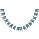 O design fornecido apresenta um padrão geométrico repetitivo. Consiste em diamante e formas de lágrima dispostas de forma estelada. As cores primárias usadas são azul, verde e branco. Cada forma de diamante é esboçada em azul, envolvendo um diamante verde menor, que por sua vez inclui uma forma de lágrima branca. O design geral cria um sentido de profundidade e complexidade. Pode servir de inspiração para padrões ou elementos decorativos.