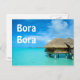 Cartão-postal de um bangalô de mel sobre a água e com um telhado talhado na lagoa azul-turquesa da ilha tropical de Bora Bora, perto do Tahiti, na Polinésia Francesa, com o texto: "Bora Bora".