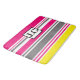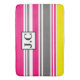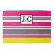 Lindo tapete de banho listrado em rosa, cinza, branco e amarelo.